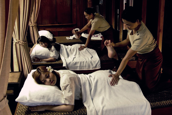 – หมอเอามือจับข้อเท้าทั้ง 2 ข้างของผู้ป่วย พร้อมออกแรงดึงและเหยียบต้นขาทั้ง 2 ข้างไปพร้อมๆ กัน ระยะเวลาการเหยียบและการออกแรงดึงต้องถามอาการ ความพึงพอใจของผู้ป่วย